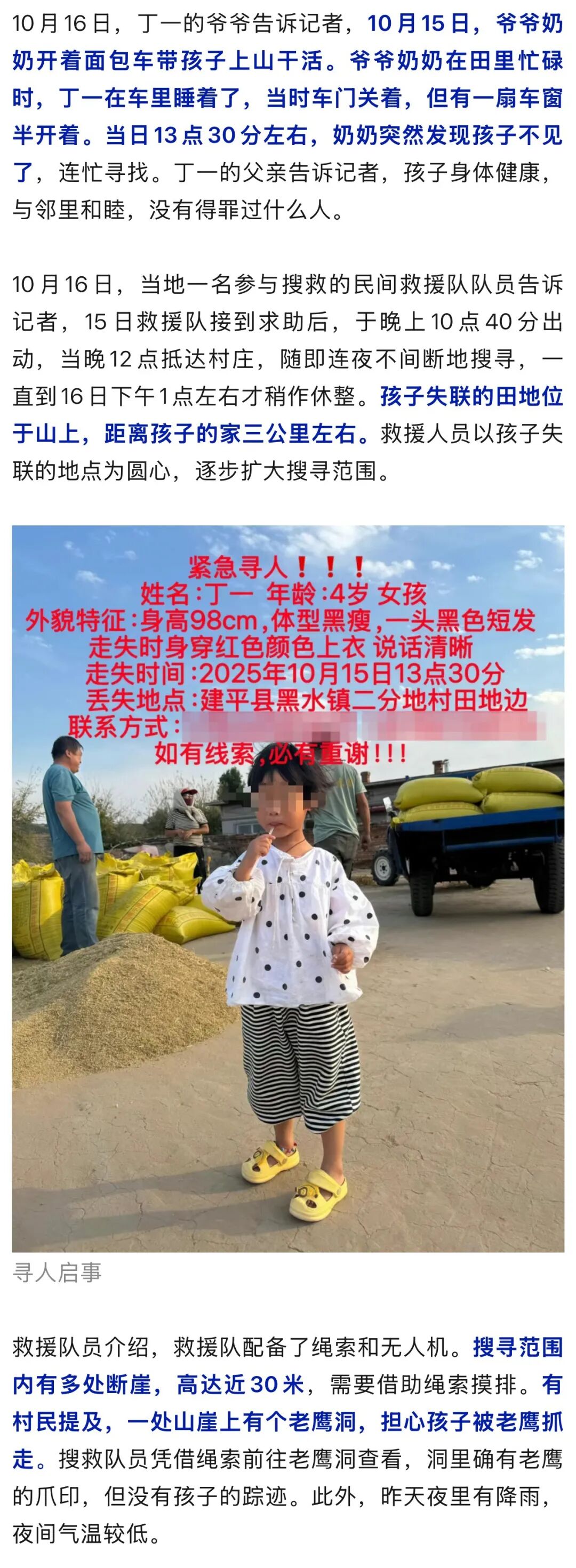 10月15日,辽宁朝阳市建平县黑水镇二分地村,一名4岁女孩丁一失联。牵动了很多人的心。今天(10月17日)上午,好消息传来,目前孩子已经被找到,身体并无大碍。
